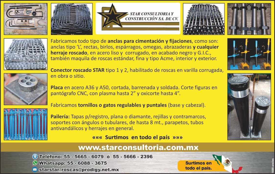 * Anclas Tipo L, Rectas, Birlos, Espárragos, Omegas, Abrazaderas y cualquier Herraje Roscado en Acero Liso y Corrugado, en Acero Negro y G.I.C, también Maquila de Roscas Estándar, Fina y Tipo ACME, Interior y Exterior.